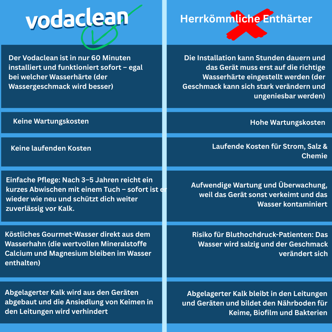 Wichtig ist: Wenn deine Leitungen oder Geräte bereits stark verkalkt sind, kann es vorkommen, dass du in den ersten Tagen mehr Kalk im Wasser hast – denn der Vodaclean reinigt deine Rohre und alle Geräte. Danach hält Vodaclean alles sauber.